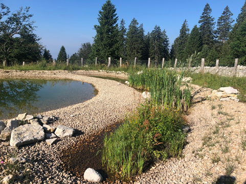 Exemple de bassin agroécologique. Partie gauche : bassin agronomique (l’eau est conduite à un abreuvoir). Partie droite : bassin écologique (végétation spontanée, structures, faible profondeur). Zone du bassin délimitée par une clôture fixe pour éviter l’entrée de bétail ou grande faune. Source : parcjuravaudois.ch